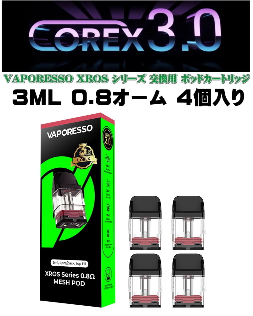 VAPORESSO XROS シリーズ COREX3.0 交換用 ポッドカートリッジ トップフィル 1箱4個入り