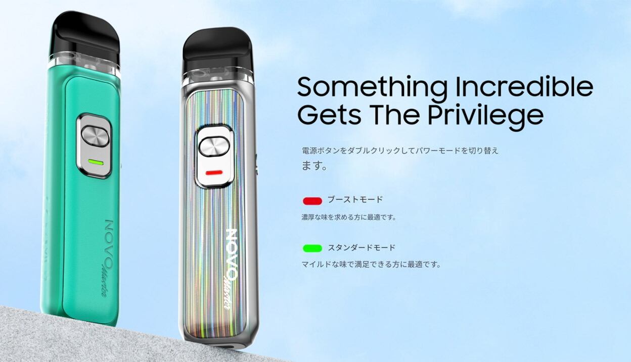 優れた体験を提供する小型で柔軟性の高いベイピングソリューション。1000mAhバッテリー内蔵。最大30W出力で長時間使用できます。ブーストモード(強烈な味わいを求める方向け)、スタンダードモード(マイルドな味わいで満足できる方向け)の2つのモードは、様々なニーズに対応します。ベイプモードはボタントリガーとオートドローの2種類。LEDインジケーターがバッテリー残量をリアルタイムで表示。さらに、チャイルドロック、トップフィルシステム、液漏れ防止設計、無段階エアフローコントロールなどの機能が搭載。NOVO / NOVO2 / NOVO2X ポッド互換。