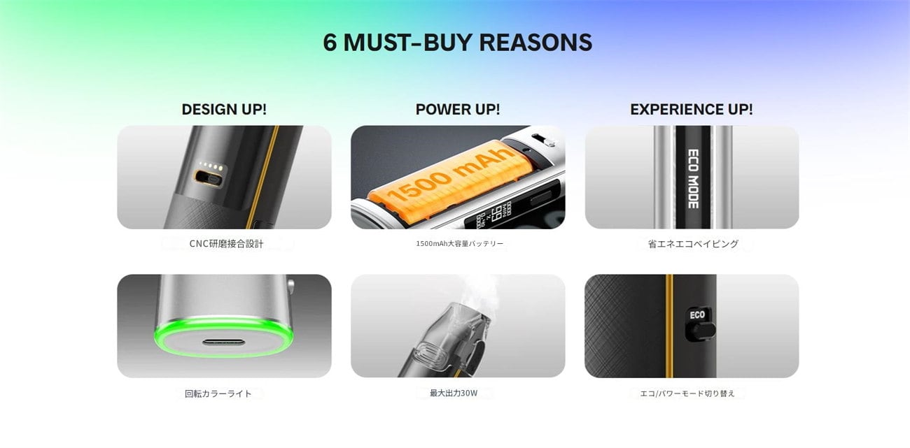 0.54インチOLEDスクリーン。バッテリーレベル、抵抗、ワット数、パフ数、およびベイプ時間を明確に表示。ステップレスのエアフローコントロール。
