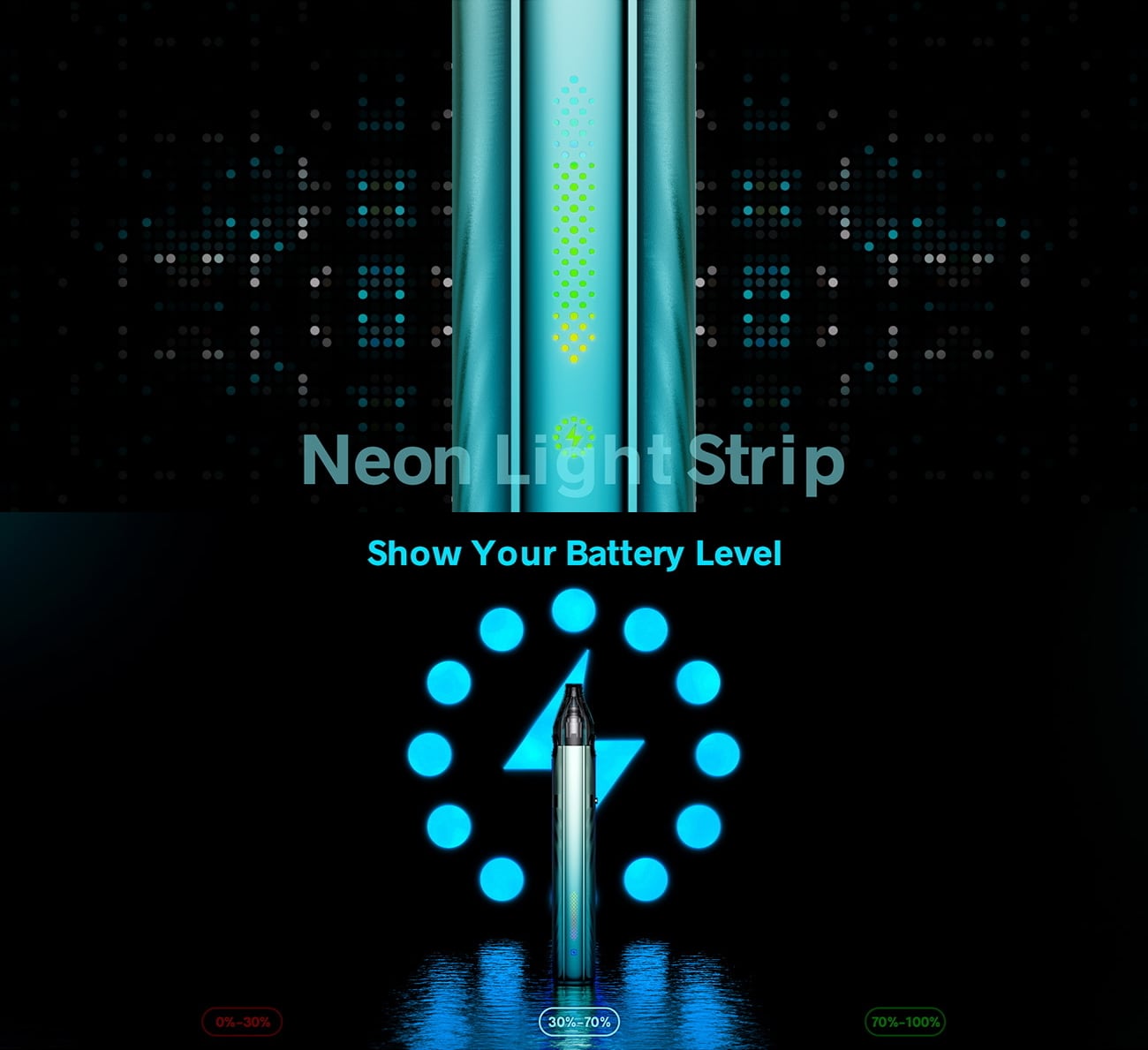 ネオンライトストリップは独立したバッテリーインジケーターとして機能し、精密なエアフロー調整によりMTLとRDLの両方のベイピングスタイルに対応します。
