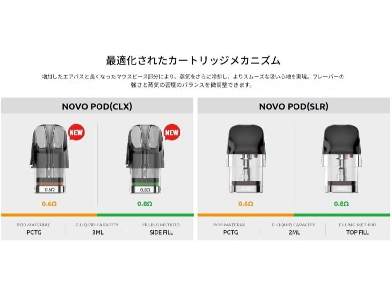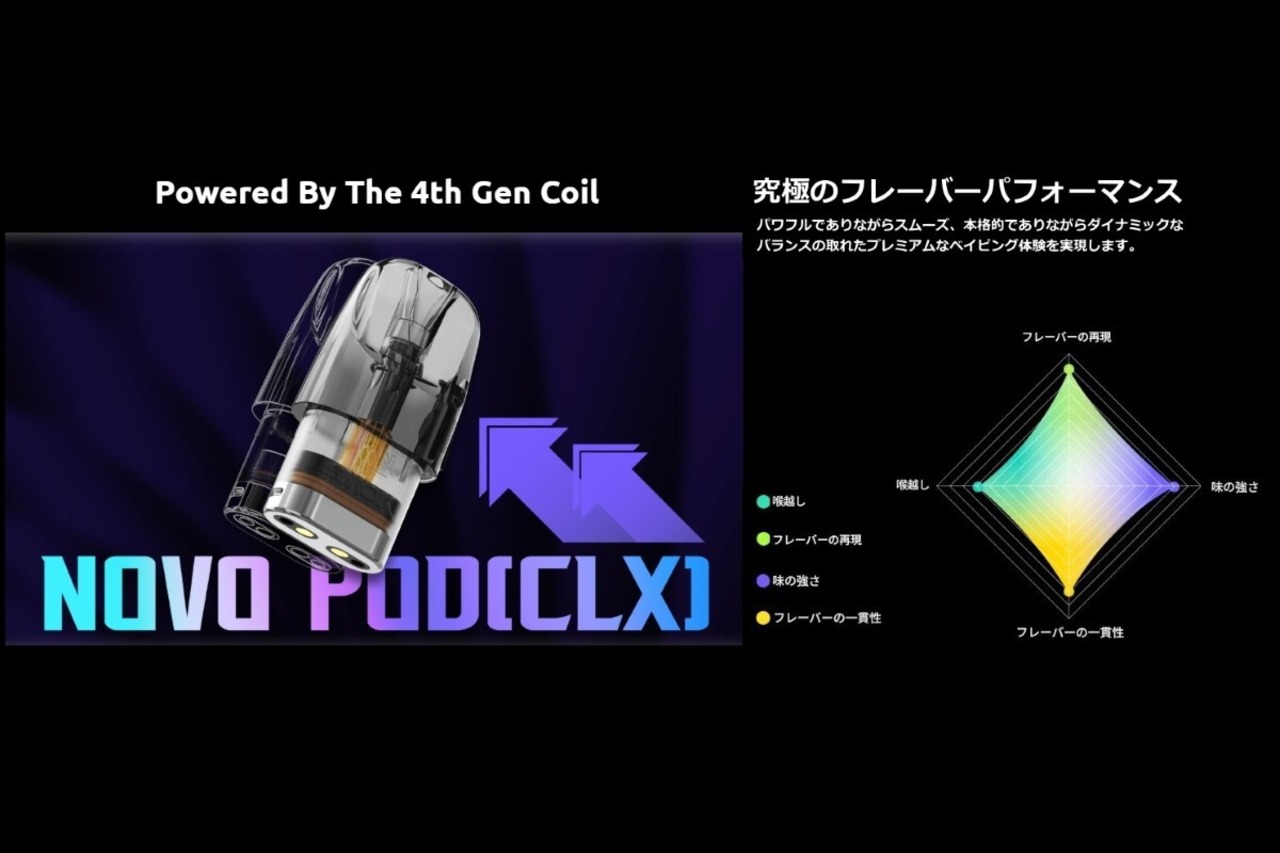 液漏れ防止技術を備えたアップグレードされたNOVO POD(CLX)シリーズ。