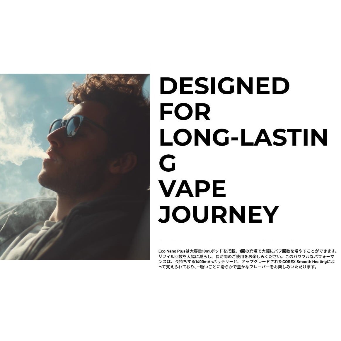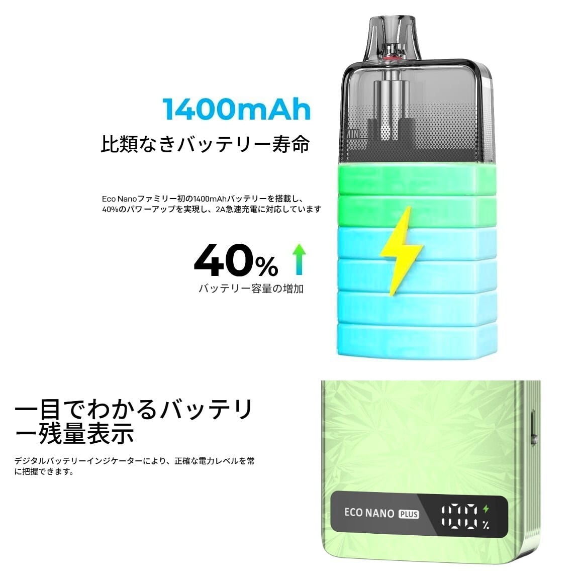 2AタイプC急速充電に対応。デバイスは素早く充電でき、最大4日間の連続使用が可能。コンパクトで洗練されたECO NANO PLUSは、信頼性の高いパフォーマンスと利便性を1つのスタイリッシュなデバイスで求めるベイパーのために設計されています。