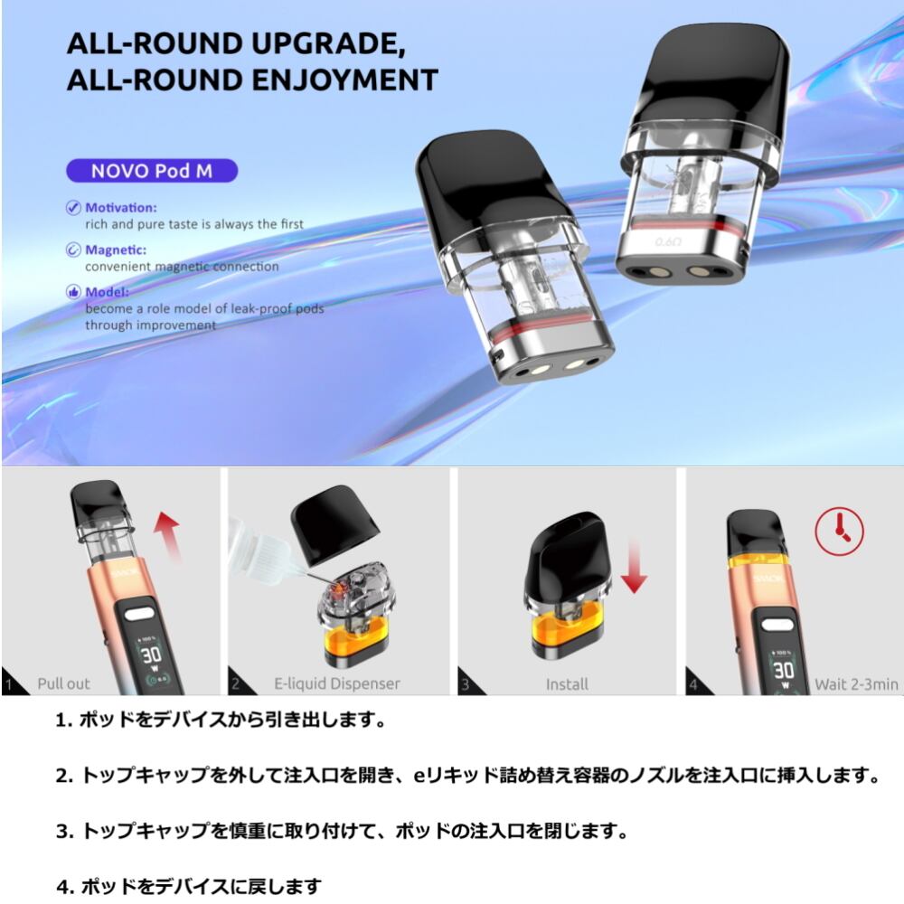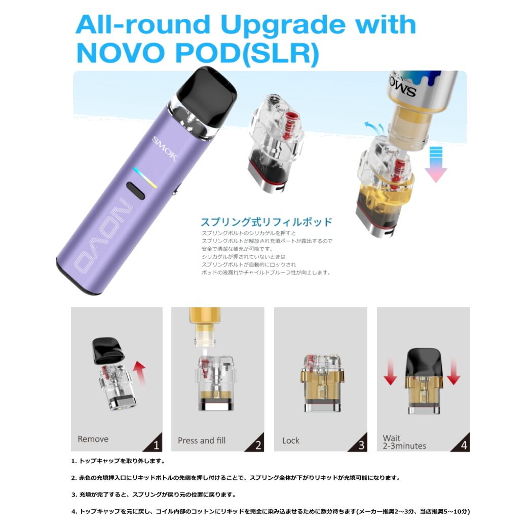空焚きによる焦げを防止する為、ポッドカートリッジ内部のコットンに、十分リキッドを染み込ませる必要があります。リキッドを充填後10分程度浸してからご使用下さい。