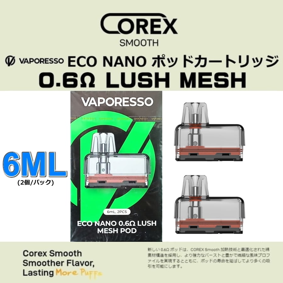 VAPORESSO ECO NANO 交換用 ポッド カートリッジ 6ml 0.6オーム 1箱2個入り LUSH MESH エコナノ ラッシュメッシュ ベイパレッソ ベポレッソ ベイポレッソ